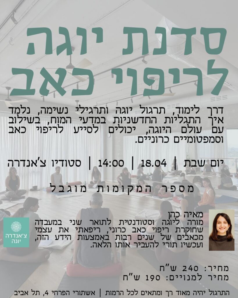 הסדנה יוגה לריפוי כאב תתקיים ביום שבת ה 18/4 בשעה 14:00 בצ'אנדרה יוגה , עם מאיה כהן.